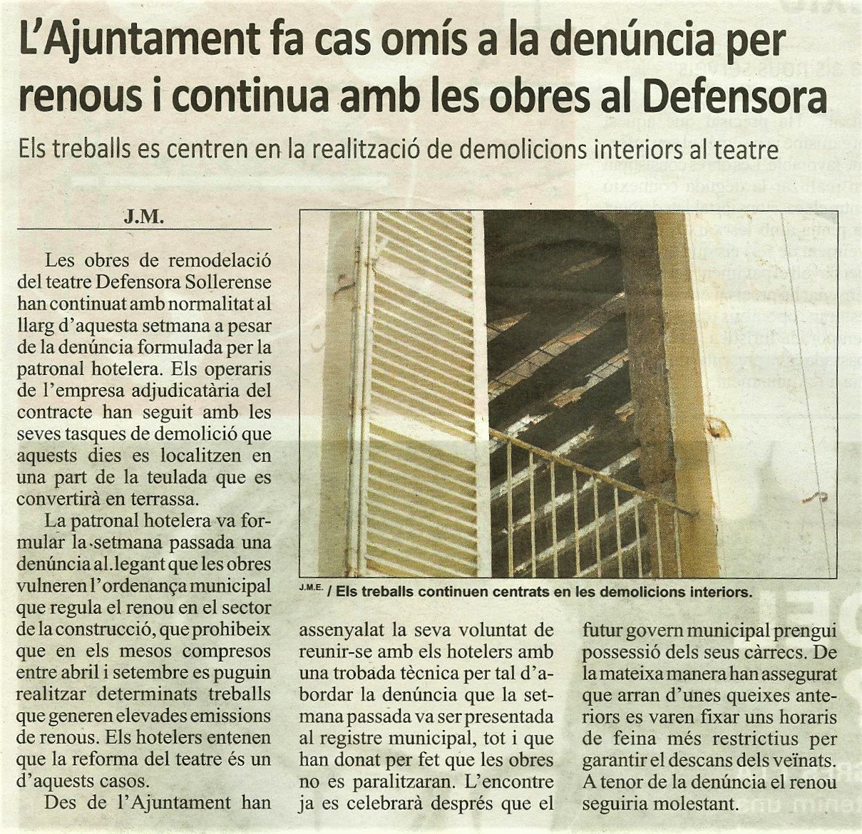 Que acabin les obres de la Defensora. "S'ha de fer alguna cosa perquè les obres de la Defensora Sollerense continuïn i els sollerics poguem disposar d'un teatre en condicions on organitzar-hi actes de tot tipus. És l'hora que totes les administracions i tots els partits polítics acordin una postura comuma. No es tracta d'una inversió per aquesta legislatura, sinó que és una inversió que Sóller podrà aprofitar sempre", diu un lector. |