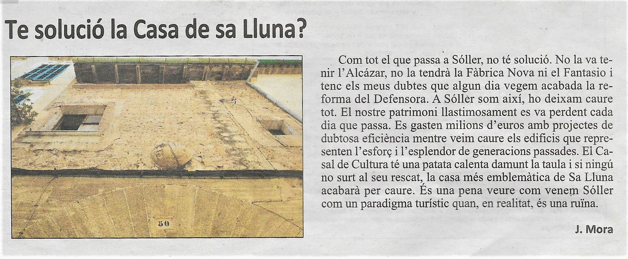 Joan Mora. Bé es podria dir que els sollerics no tenim sort. DEFENSORA. Després d’anys de projectes i promeses es va arrancar la seva restauració, avui aturada i sense perspectives que a curt termini es reprengui un projecte que havia de ser emblemàtic. Escola Ses Marjades.